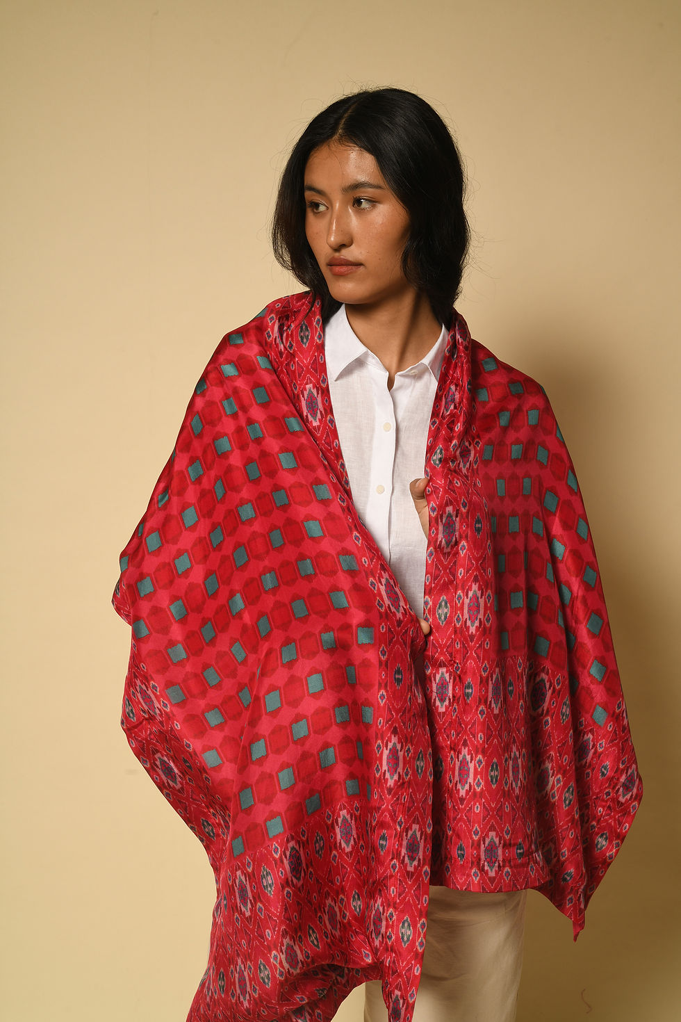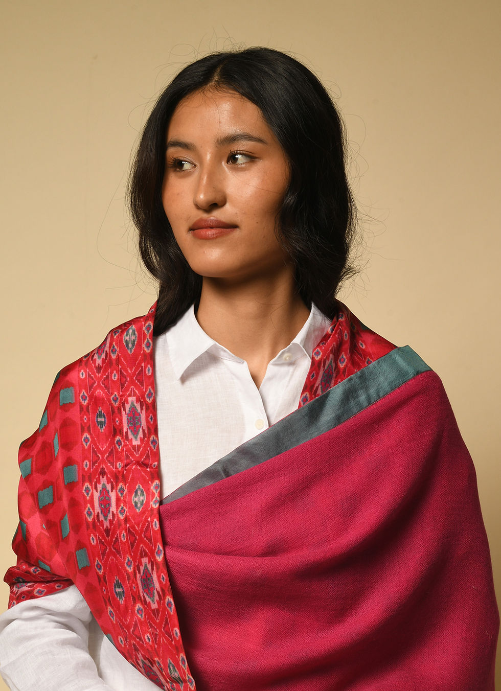 This month's best-seller needs no introduction. The Jaipur Kaftan is cut from an ikat weave first brought into the collection in 2023: bold Rajasthani geometry, hand-worked colour, and that particular pink that stops you mid-scroll. This particular print is also available in a stole and shawl.