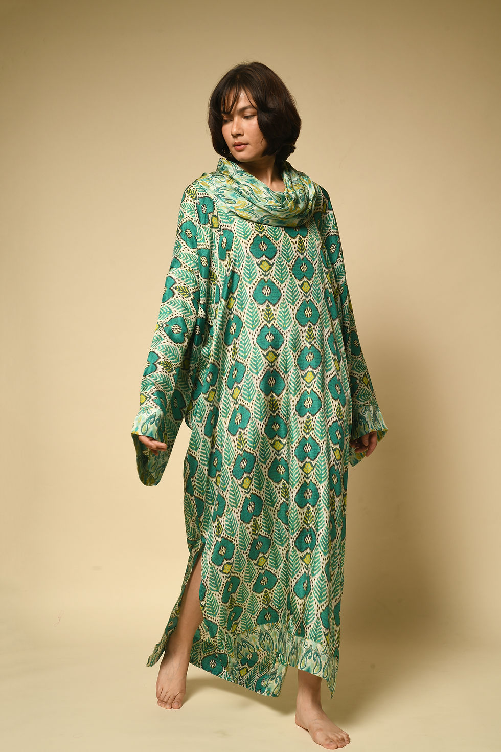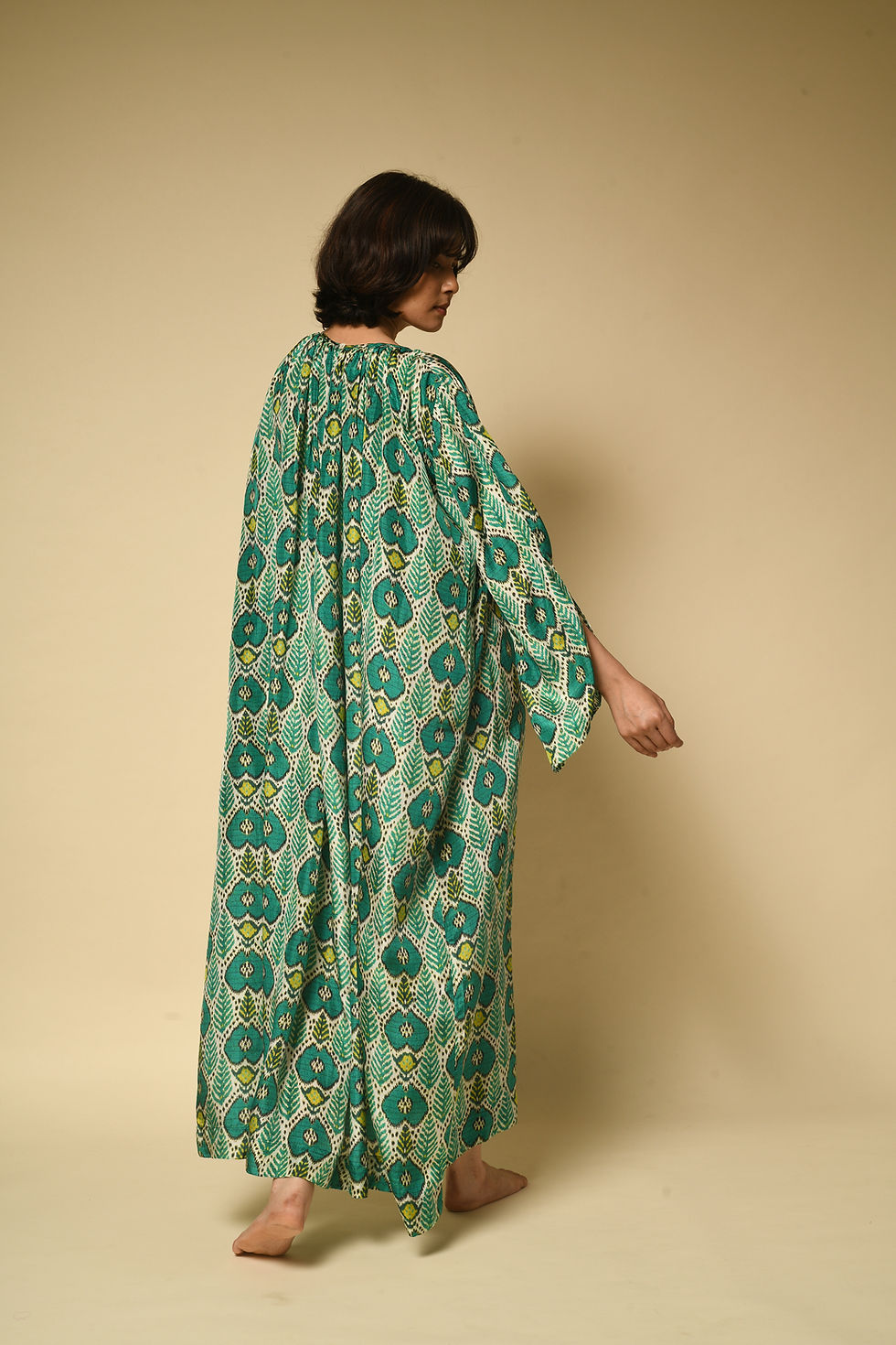 This is a free size garment designed to fit sizes XS–XXL comfortably. Click here for size chart. The Tashkent Kaftan is digitally printed on pure habutai silk. Hand-wash or dry clean only. Click here for full care guide.