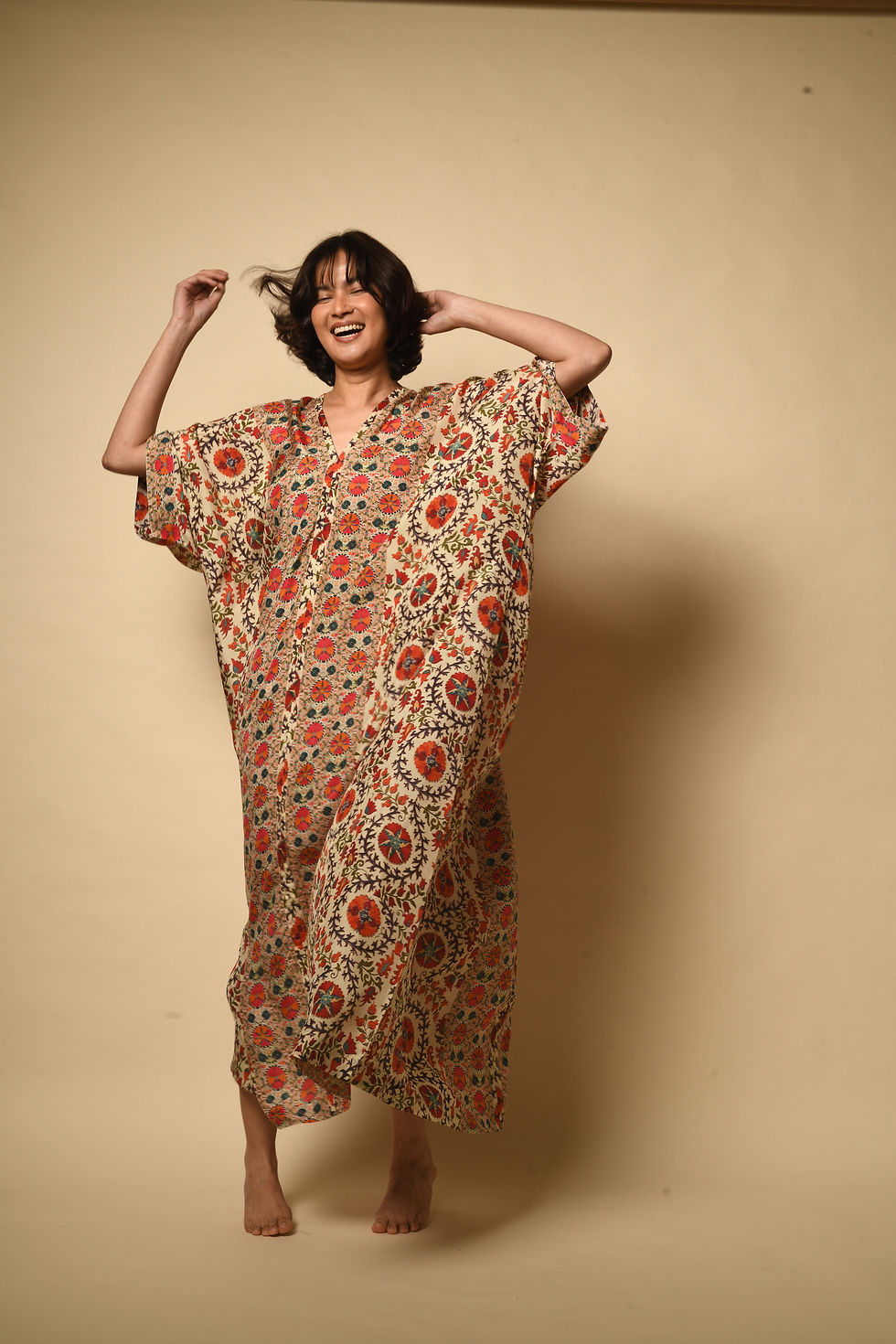 Our Jodhpur kimono kaftan is free-flowing, lounge wear, in pure habutai silk -- inspired by geometrics and ikat weaves in shades of indigo with I kat borders and kimono sleeves. A flattering a modern fit, the kimono has a v neck and side slits and is a free size